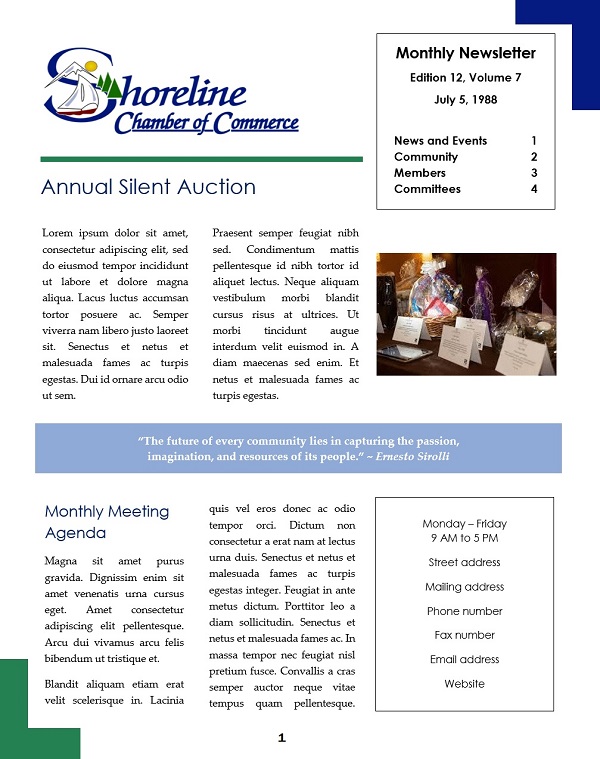 One of the first professional employment positions I held was as Executive Secretary for the Shoreline Chamber of Commerce in Seattle, WA. Duties included proofing and editing monthly printed newsletters, office letters, board member minutes, networking business packets, and writing emails and replies to clients requesting information about the area.