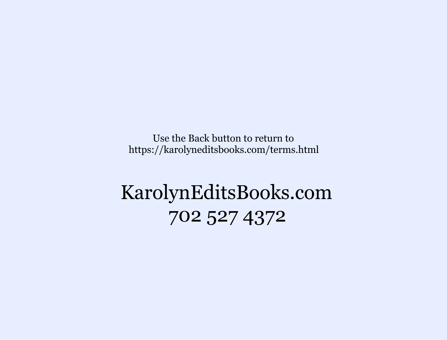 Your work will never be shared with or distributed to anyone, period, without your express permission. Authors retain full copyright protection of original content at all times, and gain copyright protection of content edited and delivered by karolyneditsbooks.com upon receipt of payment. The only exception to this is AI-generated content which is not copyrightable. Likewise, I will only use your content for the purpose of providing editing and proofreading services. In addition, your personal details, including contact information, email address, and personal communications will be kept private and never shared, sold, or rented at any time. The only exception to this rule would be in the unlikely event of nonpayment for services rendered or reversal of charges, in which case legal recourse would require the sharing of said information with the appropriate government authorities.